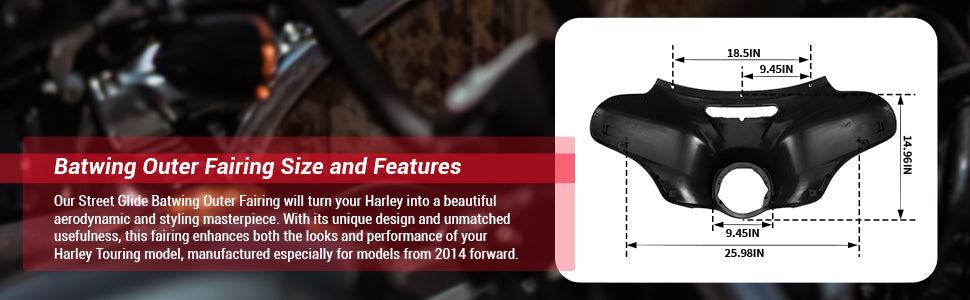 Use our Outer Batwing Fairing Cowl to give your 2014+ Harley Street Glide a new lease of life. It's an update that changes the appearance and feel of your vehicle, not merely a replacement item. Prepare to draw attention with a more streamlined and sleek look that only our fairing can provide.