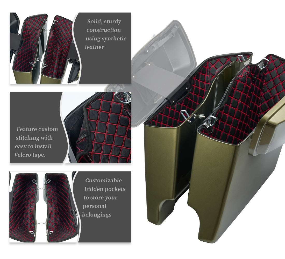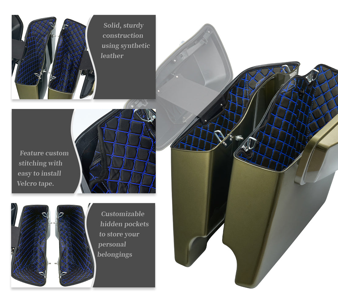 Our Harley Saddlebag Liners are the ideal solution for riders who want both style and functionality. Specifically designed to fit your bike's saddlebags, these liners offer superior protection and a personalized touch with options for custom stitching.